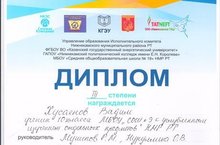 Поздравляем учащегося 10а класса Хусаенова Вадима, занявшего 3 место в Республиканском энергетическом конкурсе в направлении "Научно-исследовательские проекты". Руководители: Нуруллина Оксана Владимировна, учитель химии, Мунипов Рафаил Мунипович, учитель физики