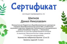 Учащиеся школы №9 Шипков Данил (5Б класс), Мухутдинов Адель (5В класс) Сулейманова Сабина (6В класс), Ермолаев Артемий (6В класс), Дусенбаев Денис (6В класс) участвовали в международном конкурсе «Экология России». Где показали отличные знания и результаты в вопросах экологии России. (Научный руководитель - учитель биологии школы №9 Ибрагимов Тимур Александрович)