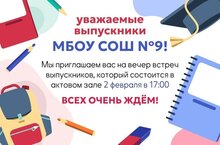 Уважаемые выпускники ! МБОУ «СОШ № 9» НМР РТ приглашает Вас на вечер встречи выпускников, который состоится 02 февраля 2024 года в 17:00 в актовом зале школы №9.