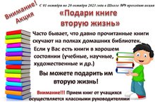21 октября 2023 года учащиеся 2А класса школы №9 приняли участие в акции «Подари книге вторую жизнь».