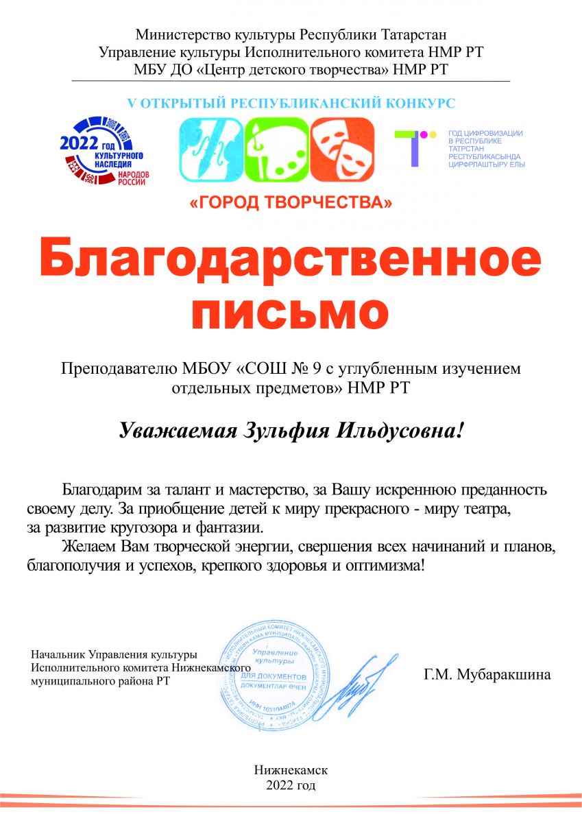 V Открытый республиканский конкурс "Город творчества". Благодарственное письмо руководителю