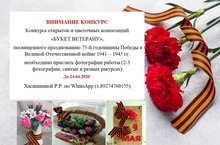 Конкурс открыток и цветочных композиций "БУКЕТ ВЕТЕРАНУ", посвященного празднованию 75-й годовщины Победы в Великой Отечественной войне 1941-1945 гг. Необходимо прислать фотограии работы (2-3 фотографии, снятые в разных ракурсах). До 24.04.2020. Хасаншиной Р. Р. по WhatsApp (т. 89274760155)