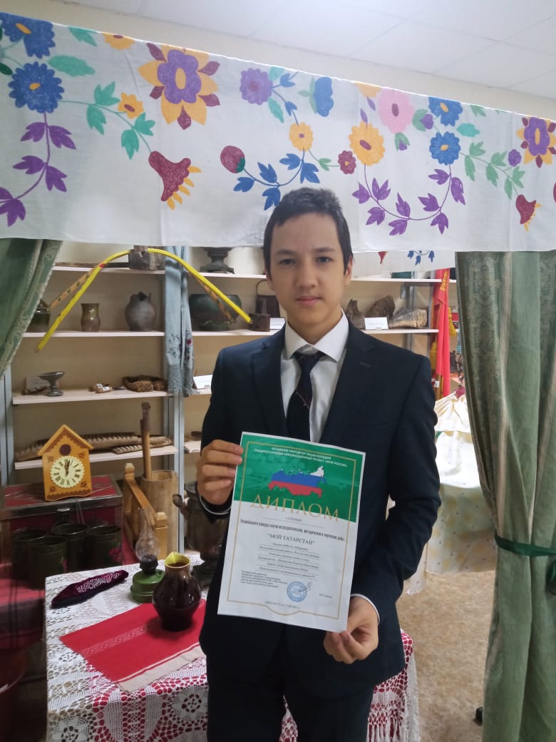 Опубликовано: 25.10.2021Ученик 7-ого класса Хамзин Айбулат принял участие в региональном конкурсе научно-исследовательских работ "Мой Татарстан". За творческую работу он награжден дипломом I степени. Руководитель - учитель истории МБОУ "Шингальчинская ООШ" Махмутова П.Н.