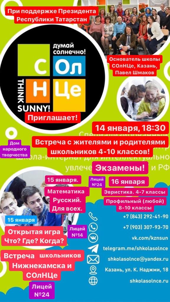 Опубликовано: 14.01.2022При поддержке Президента Республики Татарстан основатель школы СОлНЦе, Казань, Павел Шмаков, 14 января 18:30, приглашает на встречу с жителями и родителями школьников 4-10 классов, в доме народного творчества. 15 январяпройдет открытая игра Что? Где? Когда? Встреча школьников Нижнекамска и СОлНЦе, 16 января пройдут экзамены, Эвристика 4-7 классы, профильный (любой) 8-10 классы в лицее №24.