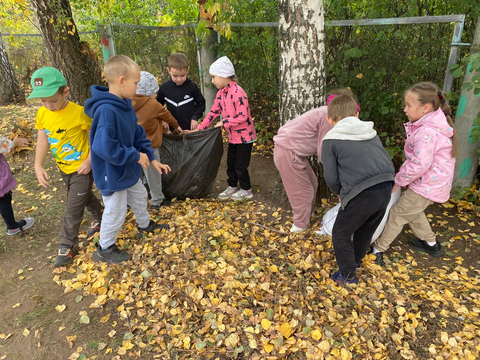 Все дети с удовольствием сгребали листья, укладывали их в мешок. Старшие дети помогали младшим.