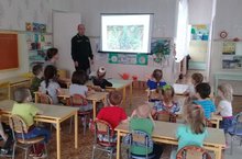 "Огонь - лесу враг!" , под таким эпиграфом прошла встреча воспитанников доу с лесным инспектором Заинского лезхоза Бычковым А. Г. Александр Геннадьевич побеседовал с детьми на тему : "Для чего нужен лес?", "Нужно ли беречь лес?". Рассказал о правилах безопасного поведения в лесу. Дети активно включились в беседу о правилах поведения при пожаре. Дружно повторяли, что спички им - не игрушки, что без взрослых в лес ходить нельзя. Надо выполнять правила поведения в лесу; и что пожарную охрану нужно вызвать по номеру 01. Дети отгадывали загадки, отвечали на вопросы, искали выход в различных ситуациях. Очень важно, чтобы эти знания закрепились в семьях. А родители - сами выполняли правила пожарной безопасности, были для детей примером.