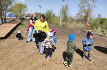 В рамках экологической акции "Преображение" сотрудники и дети детского сада "Сказка" посетили пруд посёлка и собрали мусор и сухие ветки вдоль берега. -