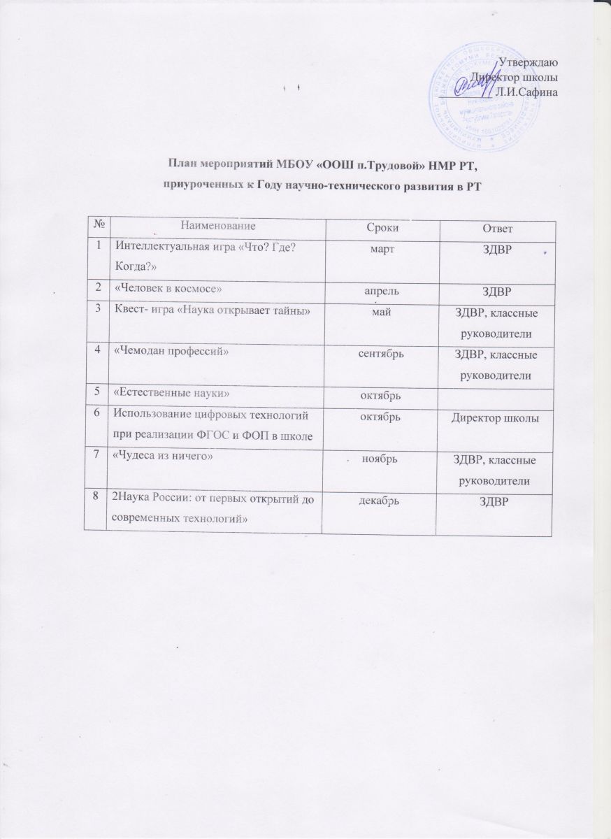 План мероприятий МБОУ "ООШ п.Трудовой" НМР РТ, приуроченных к Году научно-технического развития