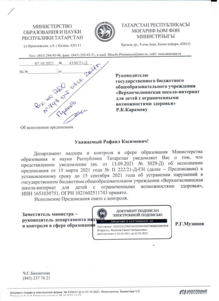 Уведомление по исполнению предписания №П 222/21-Д-ГН от 15 марта 2021 года