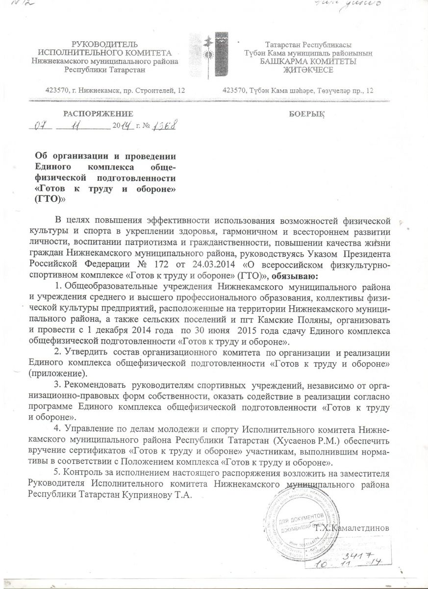 Об организации и проведении ГТО в Нижнекамском муниципальном районе