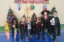 Ученики пришли на елку, нарядившись в карнавальные костюмы. Ребятишки расхаживали в нарядах героев из волшебной школы Хогвардс. В сорпт.зале их ждала нарядная новогодняя елка, а развлекали детей сказочные персонажи: дед Мороз, Снегурочка, Снеговики.