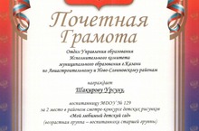 Отдел Управления образования Исполнительного комитета муниципального образования г.Казани по Авиастроительному и Ново-Савинововскому районам награждает Шакирову Урсулу,воспитанницу МАДОУ №129 за 2 место в районном смотре-конкурсе детских рисунков "Мой любимый детский сад" (возрастная группа-воспитанники старшей группы).