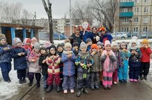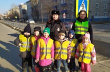 Пешеходная экскурсия "Шагающий автобус" по нерегулируемому пешеходному переходу с детьми подготовительной группы совместно с ГИБДД и ГБУ БДД.