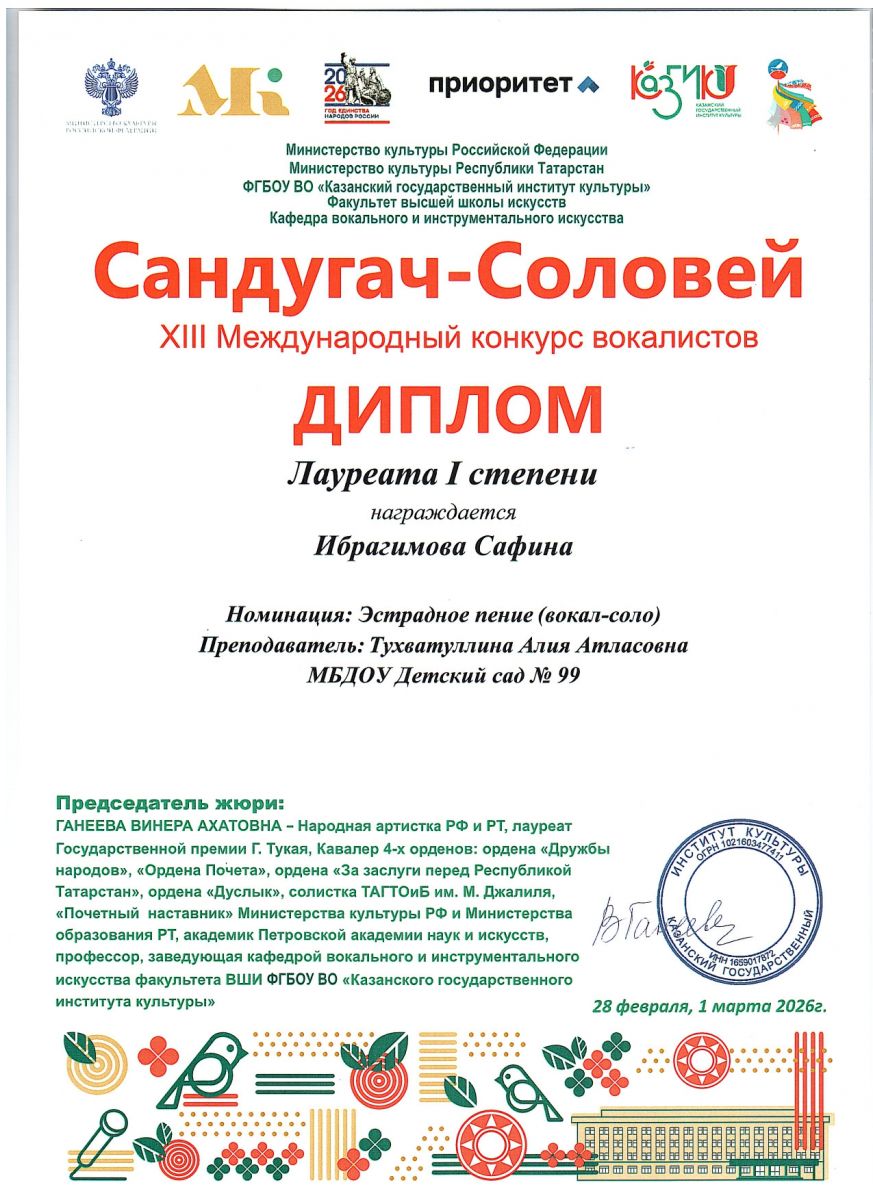 28 февраля состоялся XIII Международный конкурс вокалистов "Сандугач-Соловей". В конкурсе приняли участие наши талантливые воспитанницы подготовительной группы №13 - Ибрагимова Сафина и Максимова Самира. Под руководством музыкального руководителя Алии Атласовны, были подготовлены музыкальные песенные номера, в результате конкурса, среди многочисленных участников, девочки заняли призовые места! Поздравляем наших воспитанниц и педагога, желаем дальнейших успехов!