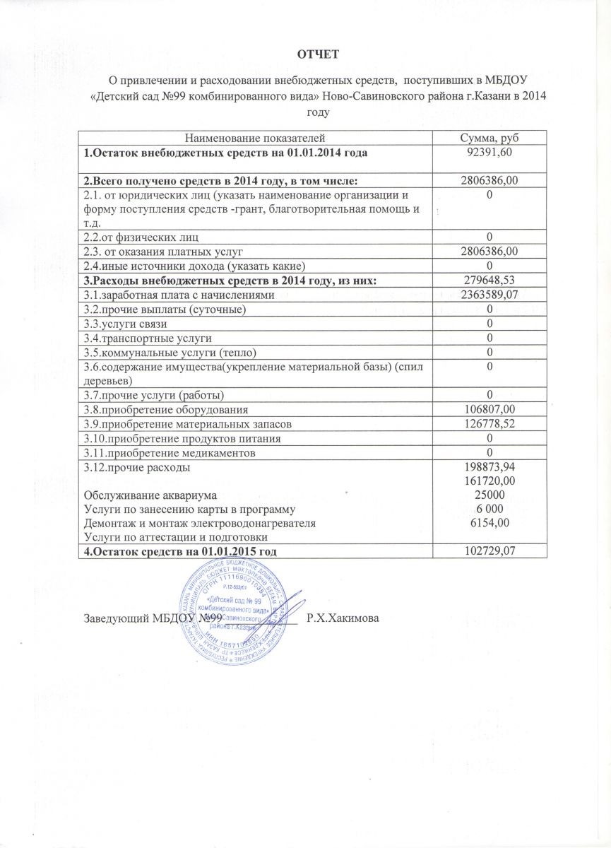 Отчет о привлечении и расходовании внебюджетных средств, поступивших в МБДОУ "Детский сад №99 комбинированного вида" в 2014году