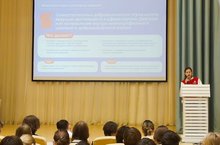 С информацией о школьных волонтёрских отрядах перед обучающимися медицинских классов выступила руководитель проекта "Программы для школьников" представитель общественного движения "Волонтеры - медики" студентка КГМУ Елизавета Кострова