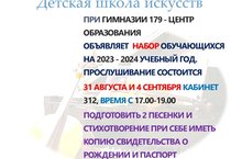 Детская школа искусств при гимназиии объявляет набор обучающхся на 2023-2024 учебный год. Прослушивание состоится 31 августа ии 4 сентября кабинет 312, время с 17.00-19.00. Подготовить 2 песенки и стихотворение, при себе иметь копию свидетельства о рождении и паспорт.