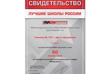 "Гимназия №179-центр образования" г. Казани вошла в число лучших школ России согласно исследованию, проведённому в 2020 году рейтинговым агентством RAEX (РАЭКС-Аналитика). Исследование проводится ежегодно при поддержке и участии более 50 ведущих ВУЗов страны. Рейтинговое агентство RAEX информирует об успехах школы руководство Минпросвещения РФ, Минобрнауки РФ, Рособрнадзора, Российский союз ректоров, а также руководство Республики Татарстан. Материалы рейтинга опубликованы агентством «ТАСС», газетой «Коммерсант-Наука», электронным СМИ «RAEX Rating Review», широко цитируются федеральными и региональными СМИ.