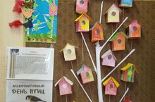 Вот уже весна пришла, Тепло с собою принесла. Будем мы ее встречать Нашей группой номер пять. Праздник есть весной красивый, международный день всех птиц! Каждому весной по силам что-нибудь соорудить. Мы пока что дошколята, нам инструменты не дают. Но мы же дружные ребята, оцените все наш труд! Этим мы хотим сказать: птицам нужно помогать! Много домиков красивых, предлагаем выбирать!