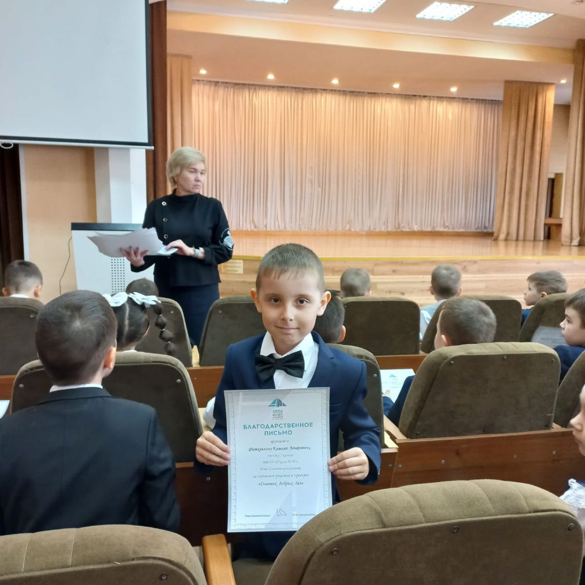 Сегодня ученик 1"А" класса, Фатхуллин Камиль побывал на церемонии награждения, которая собрала первоклассников школ Авиастроительного и Ново-Савиновского районов.Камиль был награжден благодарственным письмом за активное участие в проекте:"Дневник добрых дел".Наши поздравления