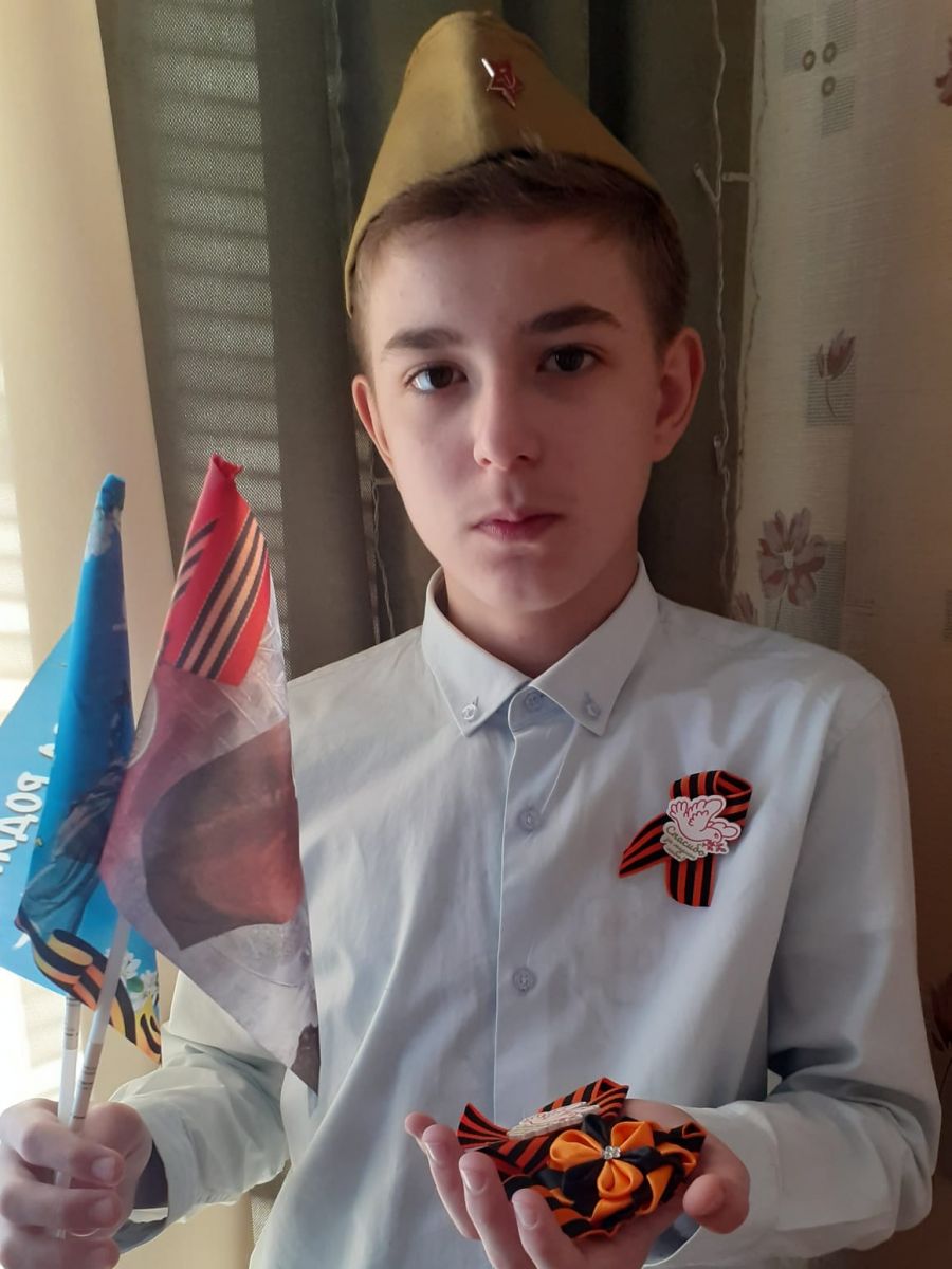 Ученик 6"Б" класса, Аникин Ранель принимает участие в патриотической акции Георгиевская ленточка