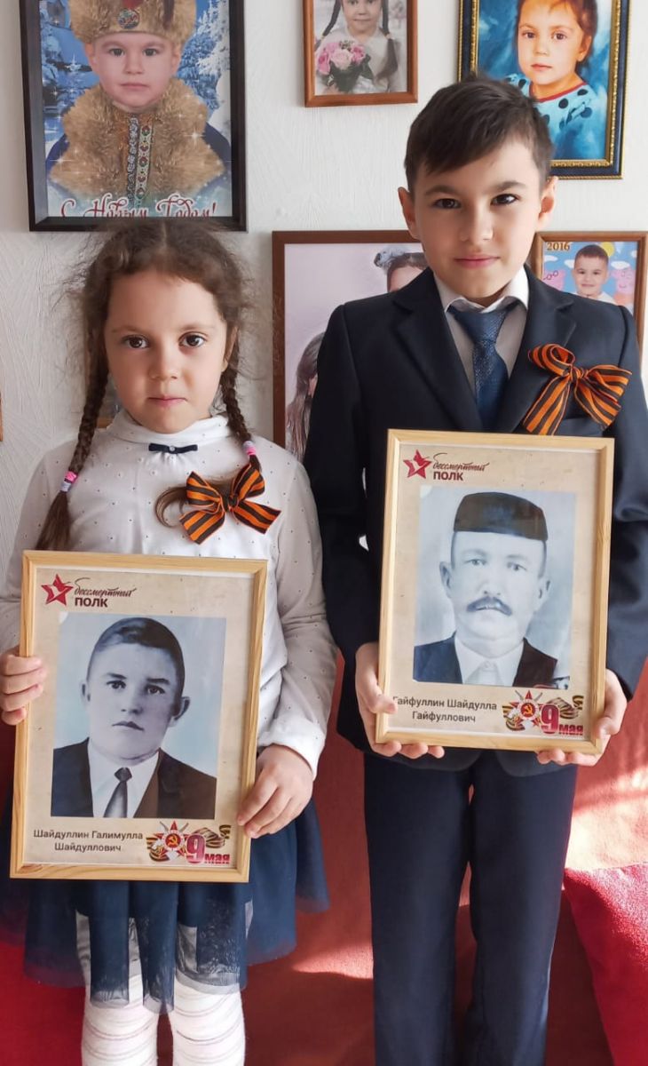 Шайдуллин Саид, ученик 3"В" класса со своей сестренкой принимают участие в Бессмертном полку-онлайн и гордятся своими прадедами.