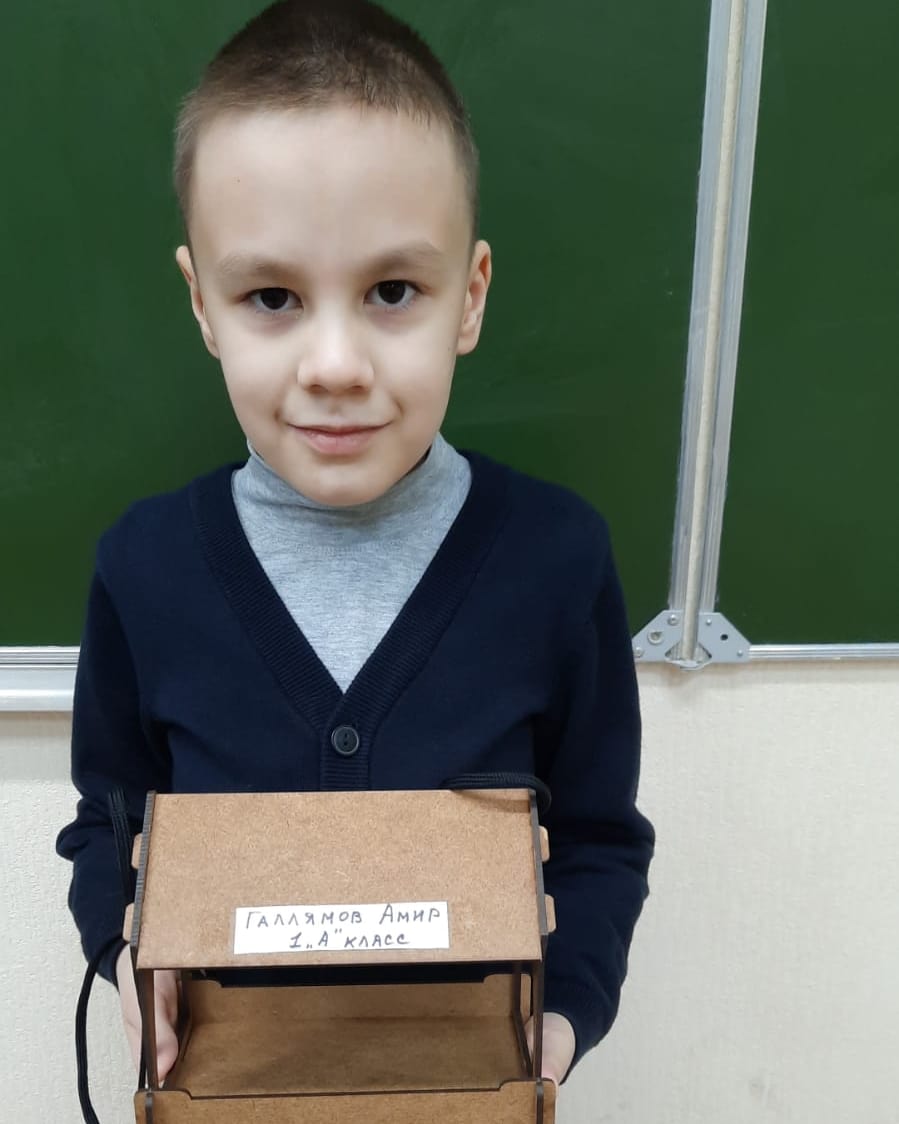 Галлямов Амир,ученик 1 "А" класса принимает участие в экоконкурсе:"Накормим птиц зимой!" в номинации " кормушка".