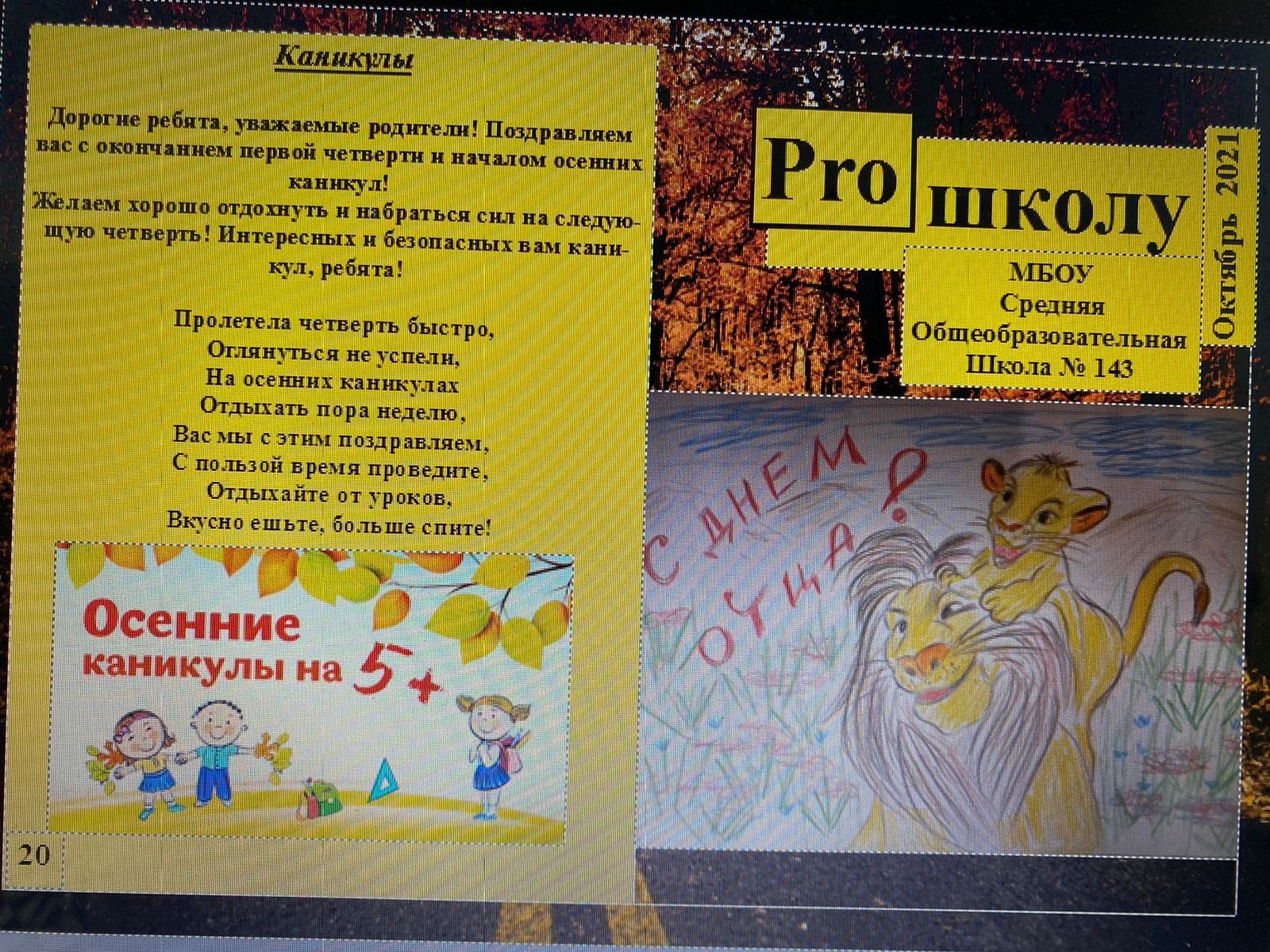 Школа – это то место, где ты делаешь свои первые самостоятельные шаги, где ты встречаешь своих первых настоящих друзей, с которыми пойдёшь рука об руку 11 школьных лет, место, где ты впервые знакомишься с такими чувствами, как самостоятельность, уверенность в себе, ответственность, стыд за несделанное домашнее задание или несдержанное слово, где ты учишься мобильности, усидчивости, проявляешь инициативу, а самое главное, ищешь себя и свой путь. Об этом и многом другом читайте в нашем выпуске школьной газеты Proшколу "Октябрь-2021".