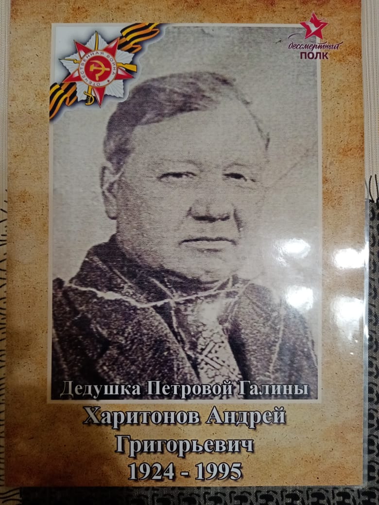Ученик 9"Б" класса Петров Никита гордится своим прадедом, Харитоновым Андреем Григорьевичем и принимает участие в акции "10 дней до Победы" "Бессмертный полк ".