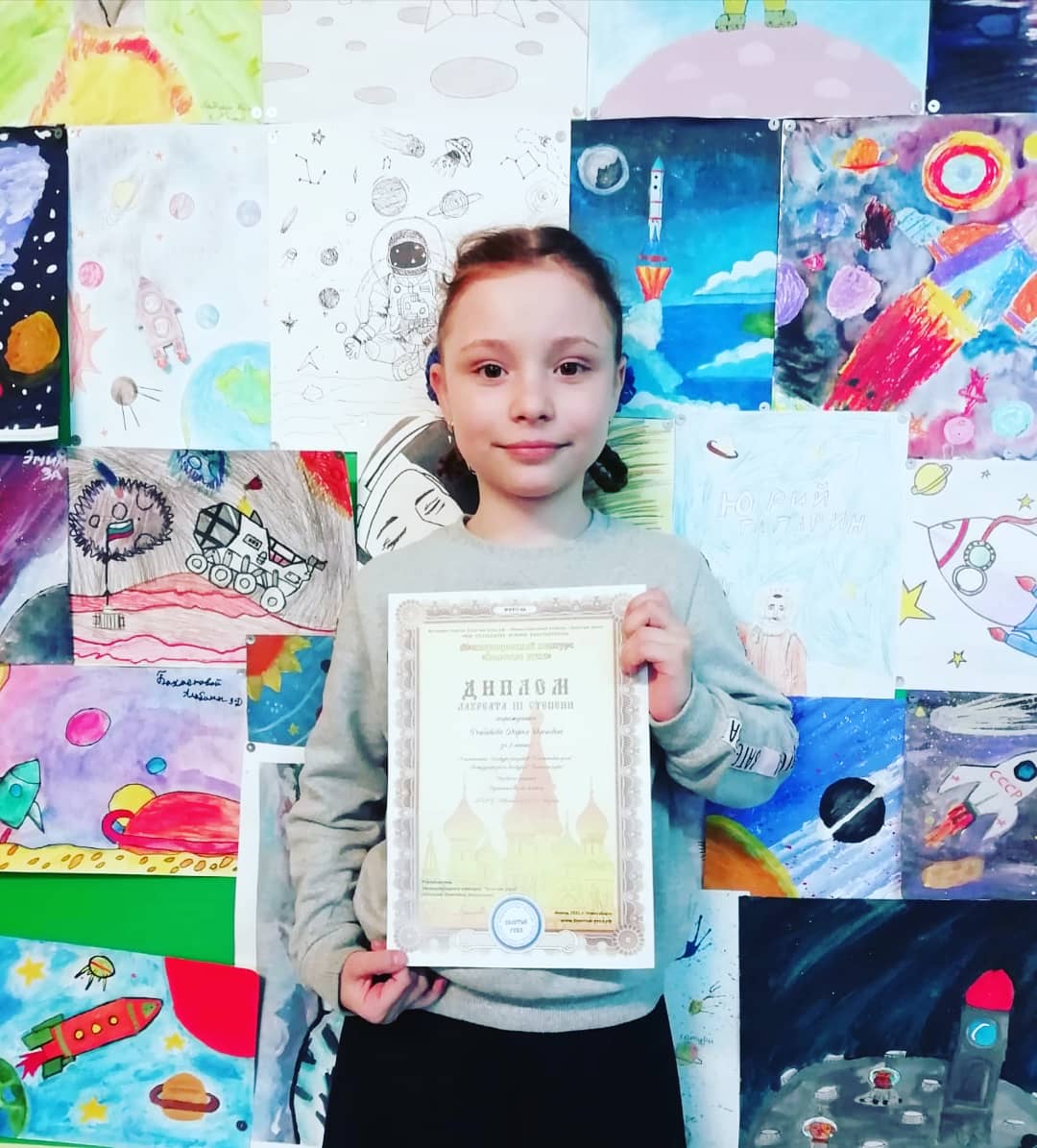 Поздравляем ученицу 2 "Г" класса Рыбакову Дарью с ПОБЕДОЙ- в конкурсе рисунков "Космические дали" Международного конкурса "Золотые руки ",название работы "Путешествие по космосу".