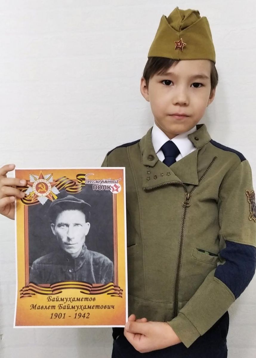 Ученик 1"Б" класса Халилов Мухаммад гордится своим прапрадедом Баймухаметовым Мавлетом Баймухаметовичем и принимает участие в акции "10 дней до Победы" "Бессмертный полк ".