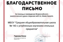 Благодарственным письмом и диплом были награждены школа и учитель английского языка, Жаркова Татьяна Александровна, за проведение всероссийского экологического урока:"Separate with Us. Waste Hazard".