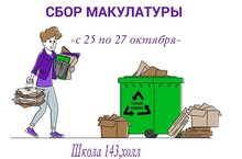 Уважаемые классные руководители, учащиеся, родители и все желающие! С 25 октября по 27 октября , в холле школы будет проходит ежегодная акция по сбору макулатуры "Помоги природе делом!".