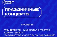 1 ноября театральная студия «Оперение» в театре кукол «Экият» представит концерт «Мы вместе – мы сила», а ДК «Нагорный» – «В единстве – сила!».