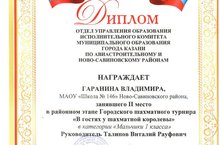 Поздравляем ученика 1Е класса Гаранина Владимира, занявшего 2 место в районном турнире по шахматам «В гостях у шахматной королевы» среди учащихся 1 класса. Желаем Владимиру и педагогу дополнительного образования Талипову Виталию Рауфовичу победного выступления на городских соревнованиях!