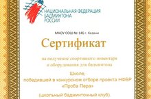 Проект Национальной Федерации Бадминтона России «Проба Пера» получил грант в виде финансовой поддержки, в число школ, получивших грант, вошла и наша.
