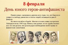 8 февраля 2016 года, в День юного героя-антифашиста, в актовом зале школы ученики10А класса (Носова Анна , Глухова Камиля, Кушарева Виктория, Кондрашин Евгений, Фасхутдинов Алмаз) провели для собравшихся 3,4,5,6 классов линейку памяти «Маленькие герои большой войны».