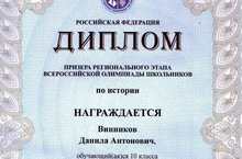 Поздравляем Винникова Данила призера Регионального этапа Всероссийской олимпиады школьников по истории!