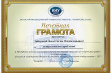 25 марта 2017 года завершился конкурс профессионального мастерства среди работников воспитательной сферы и дополнительного образования. 1 место в Республике Татарстан в номинации "ЛУЧШИЙ ЗАМЕСТИТЕЛЬ ДИРЕКТОРА ПО ВОСПИТАТЕЛЬНОЙ РАБОТЕ" завоевала КУЗНЕЦОВА АЛЕКСАНДРА ВЯЧЕСЛАВОВНА. Поздравляем!