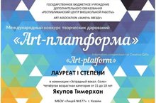 Якупов Тимерхан стал лауреатом 1 степени; Зиганшина Эмилия , Григорьева Анна, Атлас Марьям - лауреатами 2 степени Международного конкурса творческих дарований " Art- платформа " при поддержке РБУ ДО "Республиканского центра внешкольной работы". Поздравляем ребят с победами!