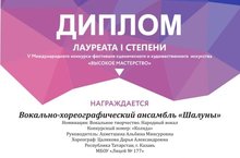Вокально- хореографический ансамбль " Шалуны" стал лауреатом 1 степени в V Международном фестивале- конкурсе сценического и художественного искусства " Высокое мастерство".