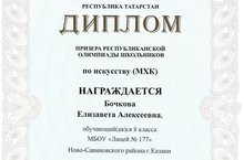 Поздравляем Бочкову Елизавету, (8 класс), ставшую призером республиканской олимпиады шкрольников по искусству (МХК)!