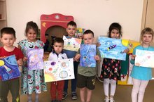 Дети старшей группы к Дню космонавтики нарисовали совместно с родителями рисунки и в группе выучили стихотворение .'' Космос нас ждёт, космос нас любит, космос привет, космос нам верит.''