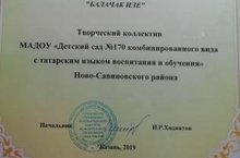 Творческий коллектив МАДОУ "Детский сад №170" Ново-Савиновского района г.Казани награжден дипломом Управления образования Исполнительного комитета муниципального образования г.Казани.