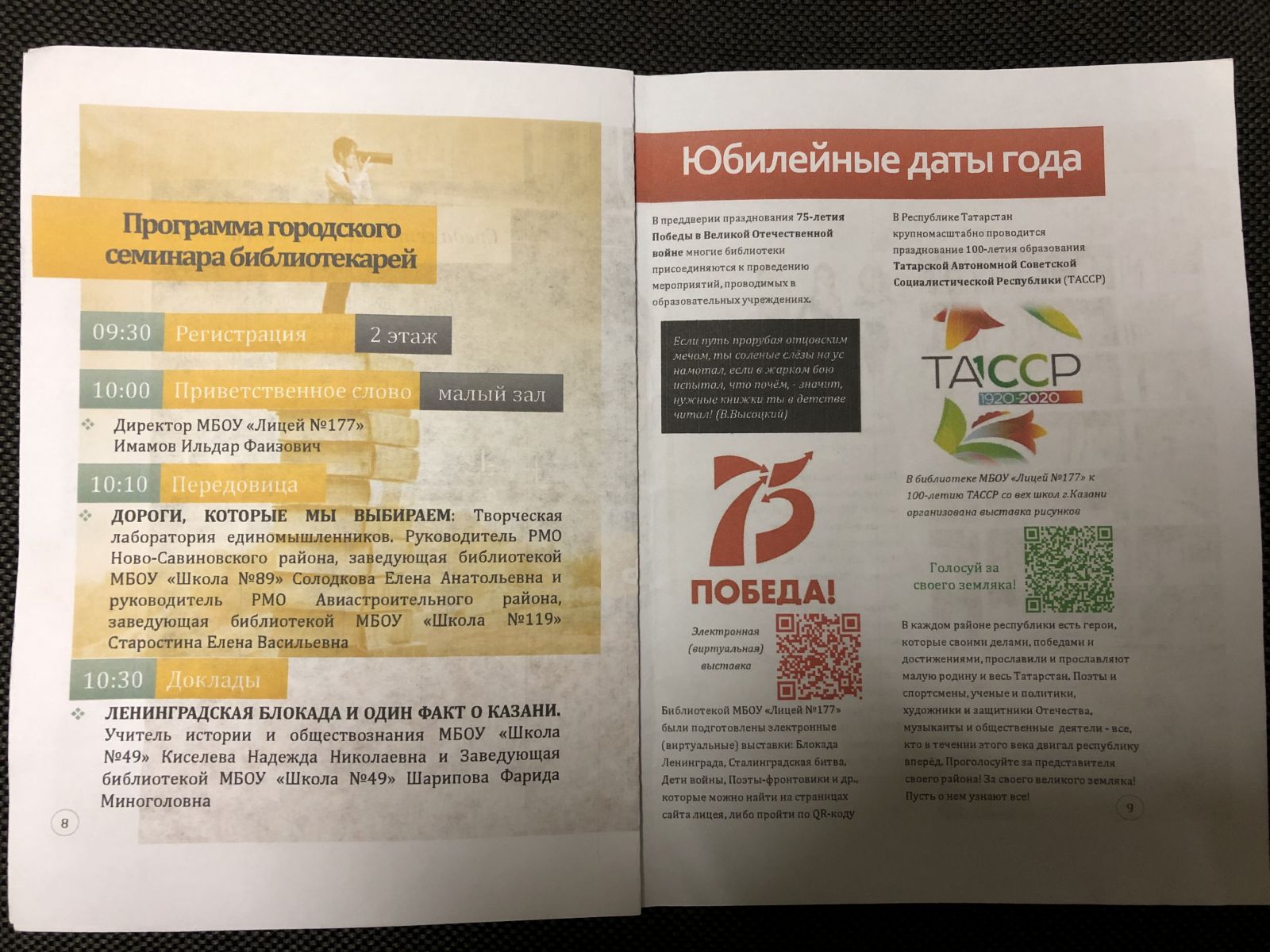 Опубликовано: 26.02.2020Вокальный ансамбль "Лада +", руководитель Алексеева Наталья Александровна, принял участие в Городском семинаре библиотекарей, посвященный 75 - летию Победы и 100 - летию ТАССР./upload/storage/org5614/files/IMG_5246.jpg