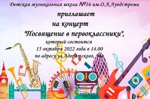 ДМШ 16 им. О. Л. Лундстрема приглашает на концерт -" Посвящение в первоклассники" 15.10.2022