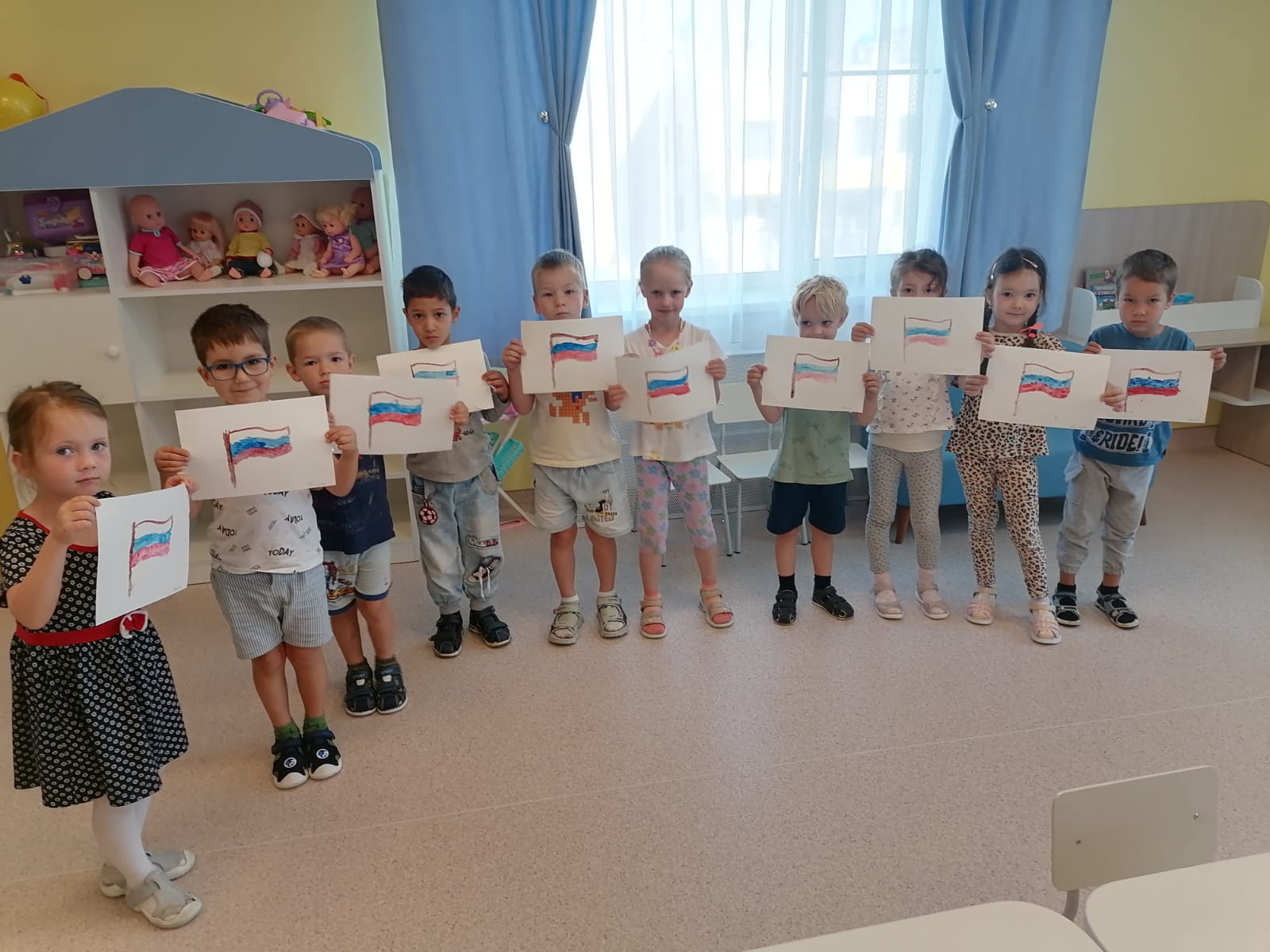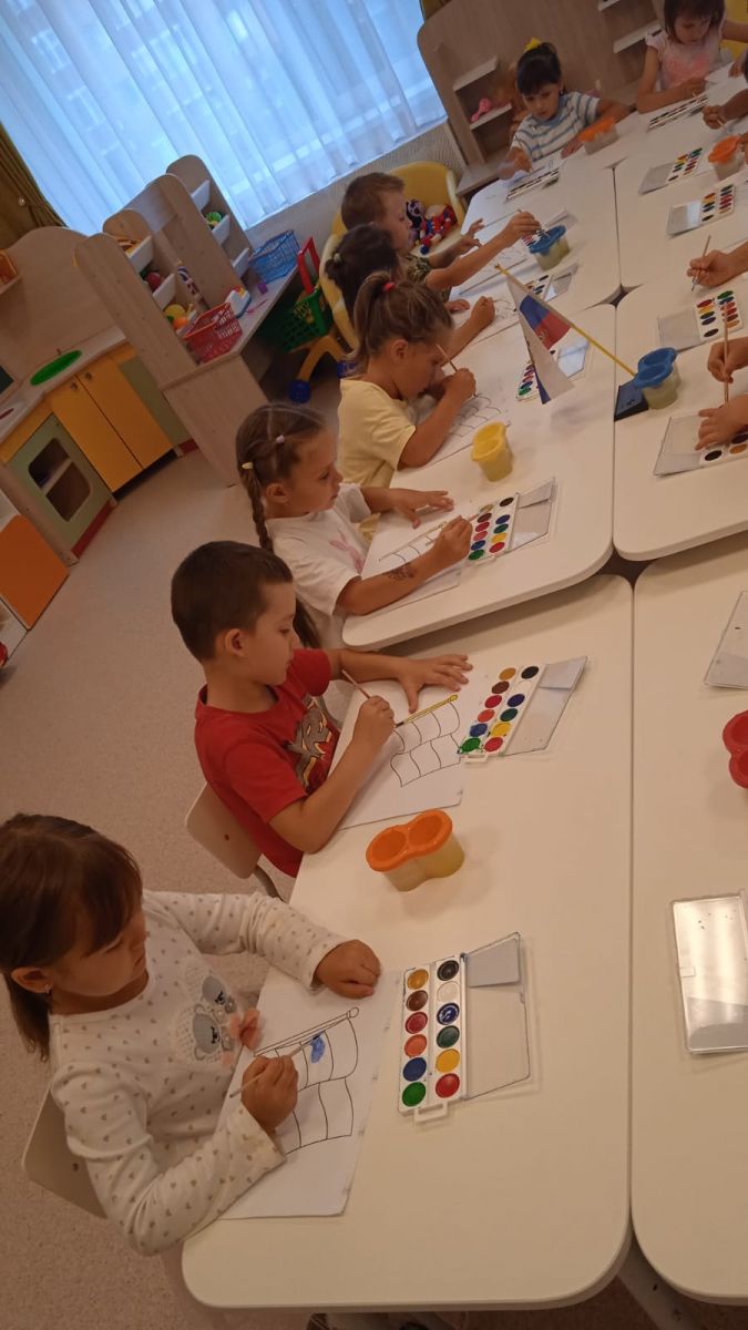 У детей 8 и 10 групп была проведена изобразительная деятельность на тему: "Флаг России"