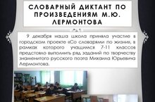 В рамках Всероссийского проекта "Со словарем по жизни" и Всероссийской акции "Грамотным быть модно" в школах Авиастроительного и Ново-Савиновского районов города Казани 9 декабря 2014 года проводился Общероссийский словарный диктант-викторина, который посвящен 200-летию со дня рождения М.Ю.Лермонтова. В акции приняли участие 11 общеобразовательных организаций Авиастроительного района и 16 – Ново-Савиновского района.