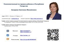 График личного приема граждан Уполномоченным по правам ребенка в Республике Татарстан: по вторникам с 14.00 до 18.00 (по предварительной записи по тел. (843) 236-61-64). График приема граждан сотрудниками Аппарата: каждую среду с 9.00 до 18.00.