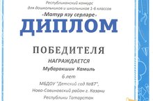 Поздравляем Мубаракшина Камиля, воспитанника подготовительной группы, и Гатауллину Гульнару Равиловну, воспитателя по обучению татарскому языку, с победой в «Республиканском конкурсе для дошкольников и школьников 1-6 классов на татарском языке «Матур язу серләре!»
